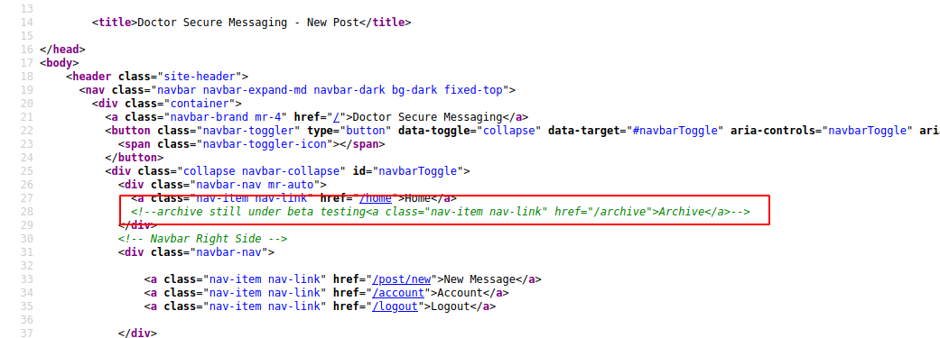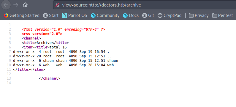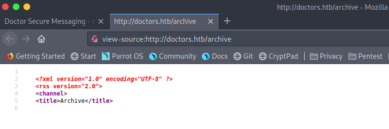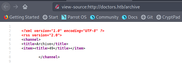 On visiting http://doctors.htb we get a blank page but on viewing the source code we find that it has some xml data.