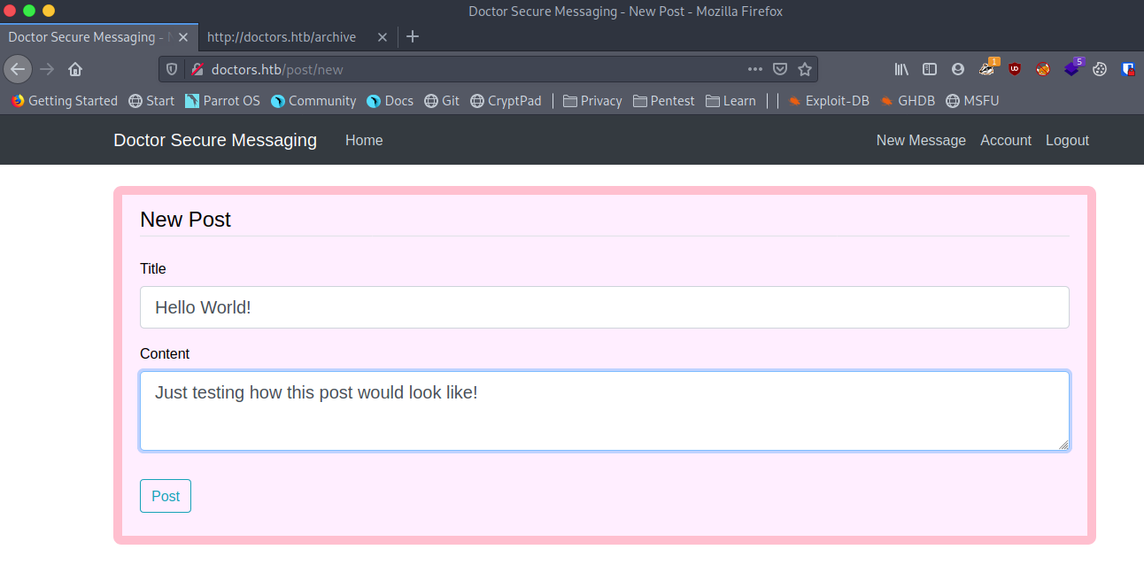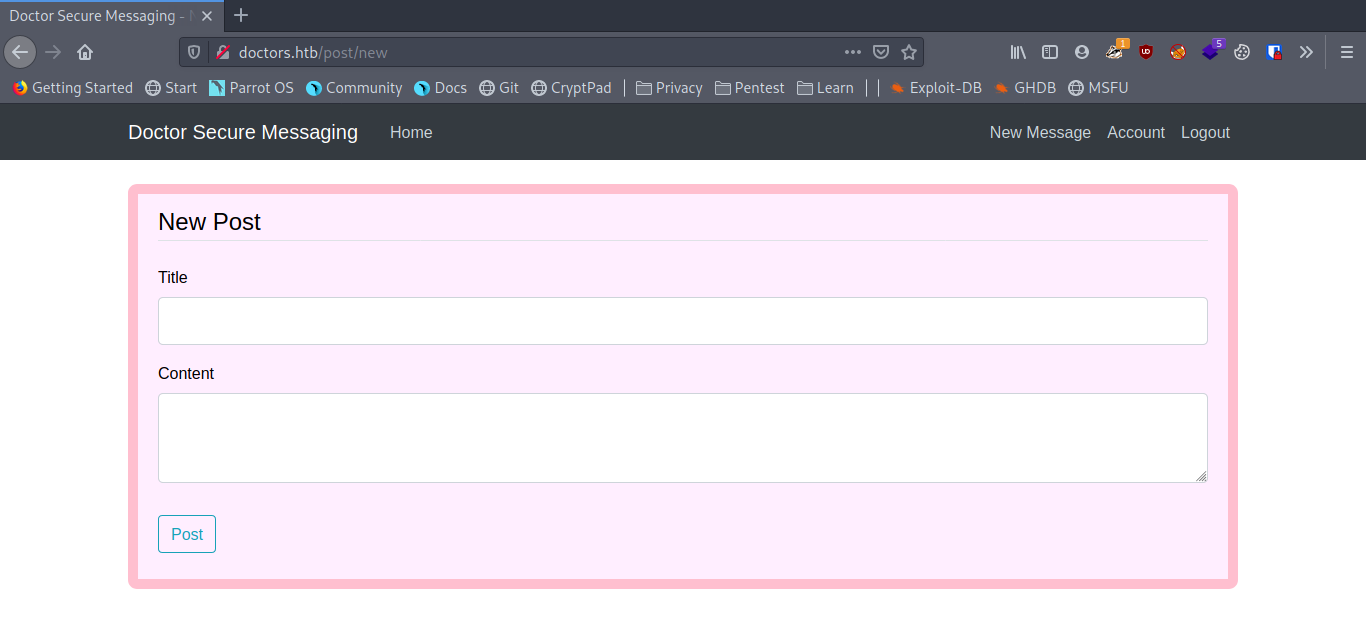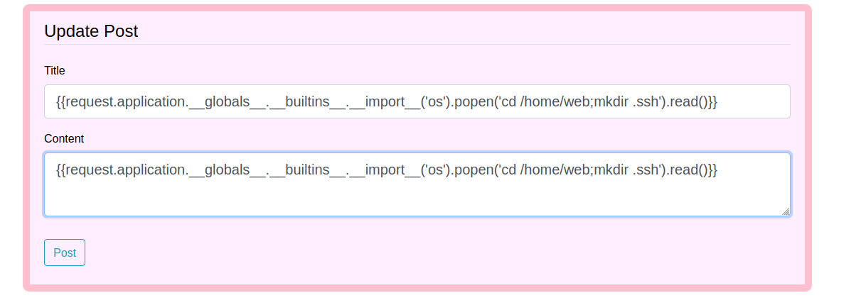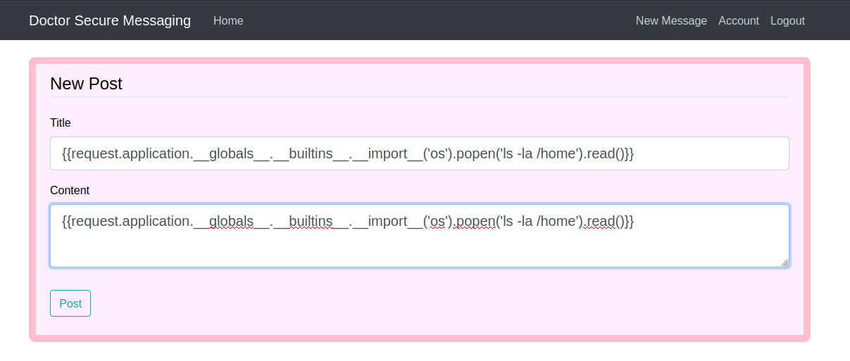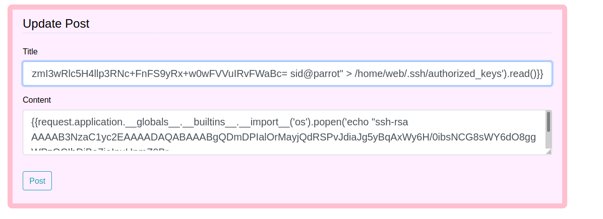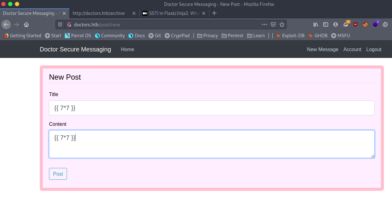 Create a new post and inject {{ 7*7 }} if we are able to inject code then this payload should get evaluated.