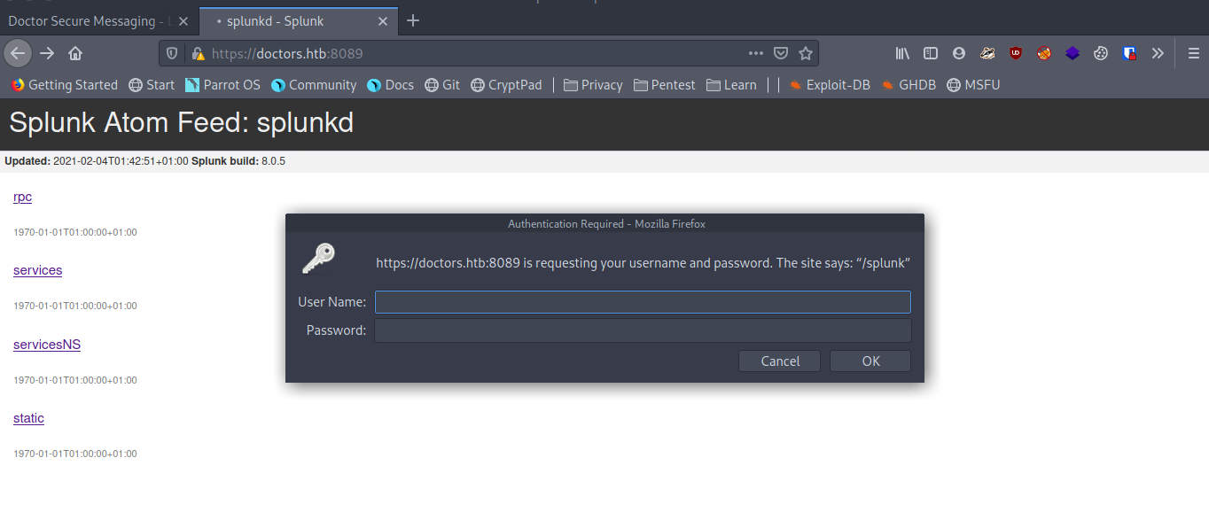 Looks like we have Splunk running on port 8089, Splunk is a data analysis tool and it can be used for analyzing log.s