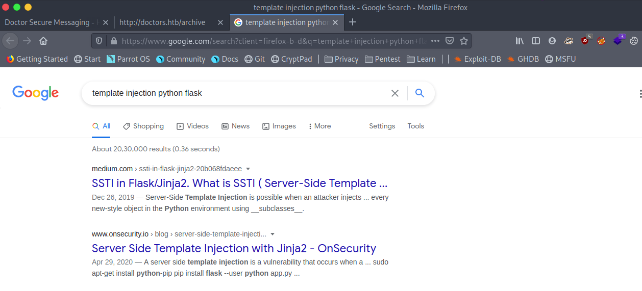 10.10.14.4 - - [05/Sep/2020:11:17:34 +2000] "POST /reset_password?email=Guitar123" 500 453 "http://doctor.htb/reset_password"