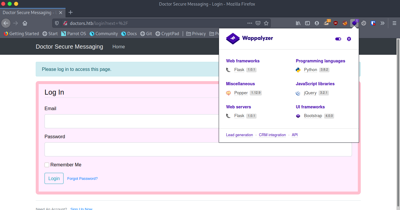 The virtual host reveals a “Doctor Secure Messaging” page and wappalyzer tells us that python flask is the technology being used </p>